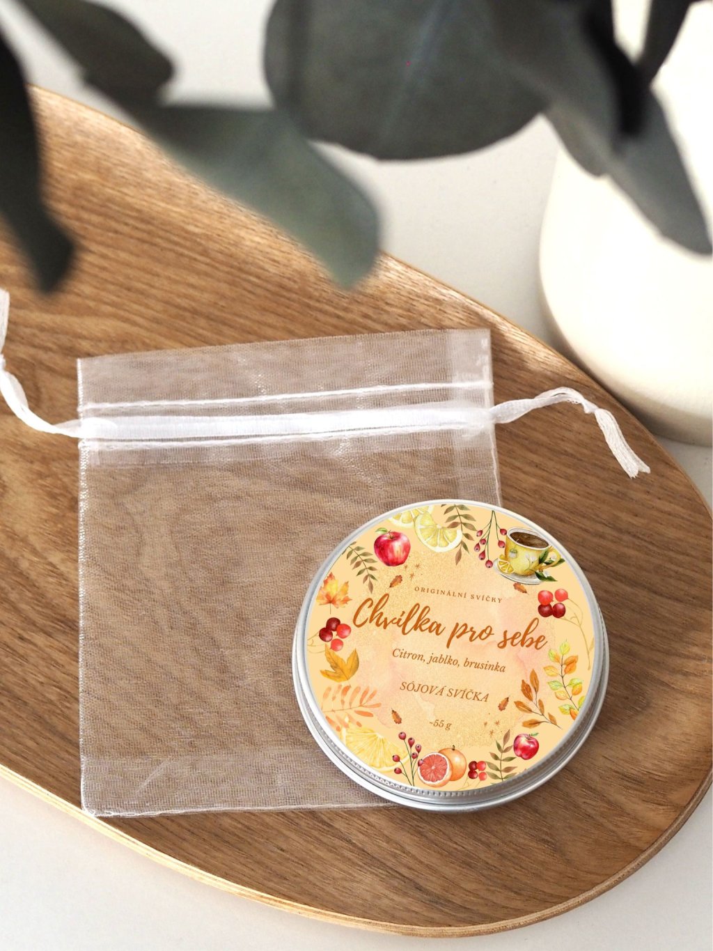 Dopřejte si chvíli jen pro sebe – malá sójová svíčka v plechovce „Chvilka pro sebe“ rozjasní den svěží kombinací citronu, jablka a brusinky. Je lehká, šťavnatá a příjemně osvěžující.
