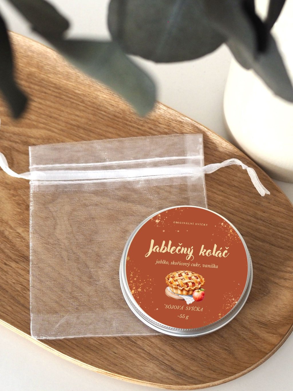 Vůně jablka, skořicového cukru a vanilky. Sójová svíčka Jablečný koláč (55 g) v plechovce. Ručně vyráběná, dárkově balená v organzovém sáčku