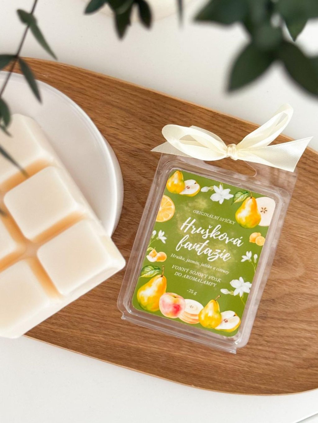 Svěží ovocná vůně hrušky, jablka, jasmínu a citrusů. Sójový vosk do aromalampy Hrušková fantazie rozjasní váš domov a navodí lehkou atmosféru.